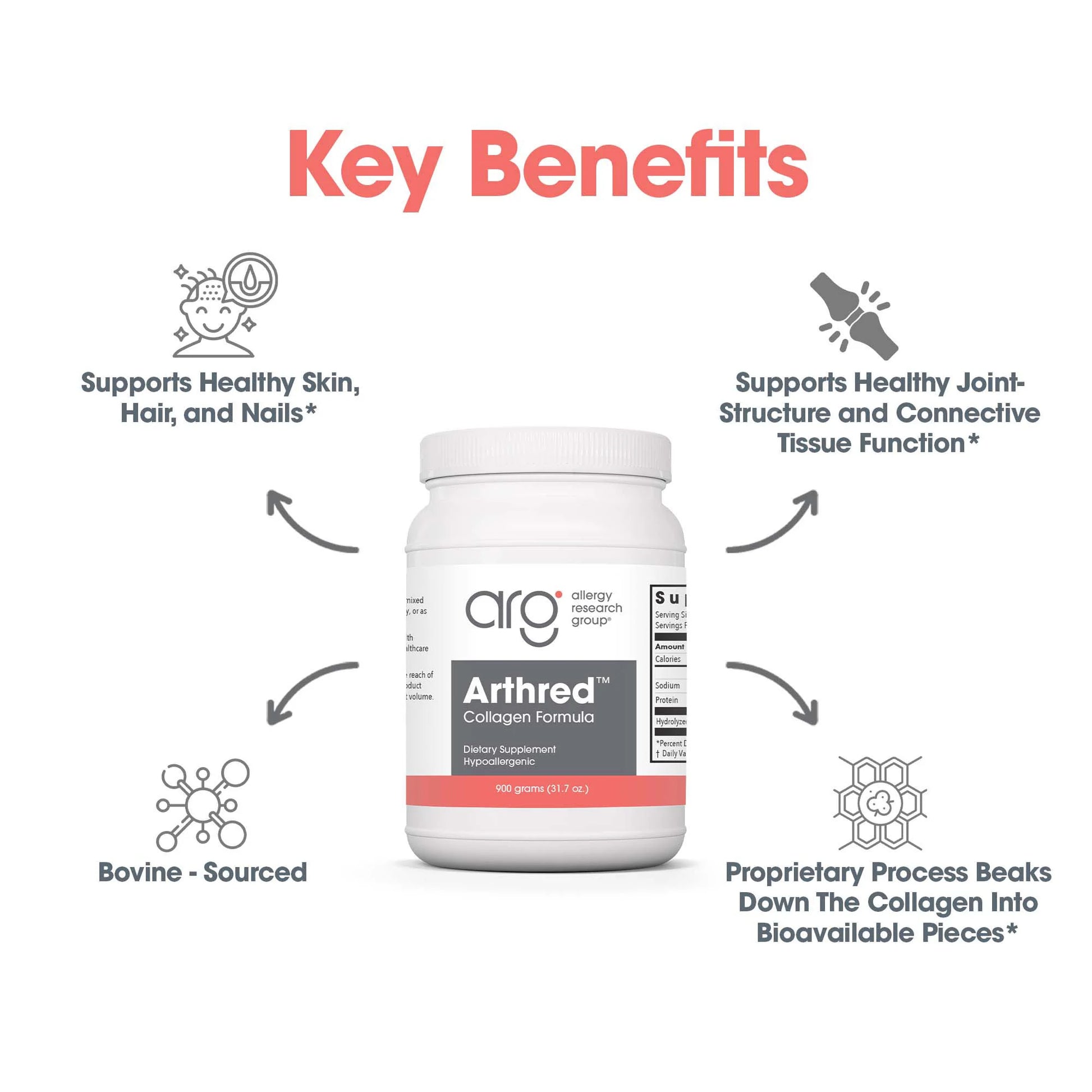 Arthred is hydrolyzed (predigested) powdered collagen (bovine source) for connective tissue support.* Connective tissue is found throughout the body.