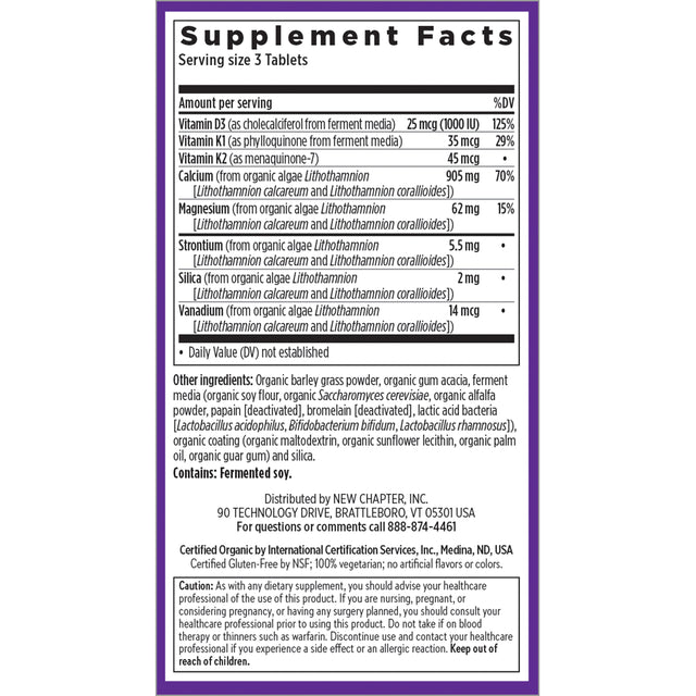Serving Size: 3 Tablet Servings Per Container: 20 Disclaimer Amount Per Serving Vitamin D3 (TargetCal) 1000 IU Vitamin K1 (TargetCal) 35 mcg Vitamin K2 (MK-7) (TargetCal) 45 mcg Calcium (from Algae ) 905Â mg Magnesium (from Algae ) 62 mg Strontium (from Algae ) 5.5 mg Silica (from Algae ) 2 mg Vanadium (from Algae ) 14 mcg Other ingredients: Ferment media (organic milled soy, organic Saccharomyces cerevisiae, organic maltodextrin, organic gum acacia, lactic acid bacteria [L. acidophilus, B. bifidum, L. rhamnosus, papain [deactivated], bromelain [deactivated]), organic barley grass, organic gum acacia, maltodextrin, hypromellose, silicon dioxide, and sunflower oil, Contains: Fermented soy