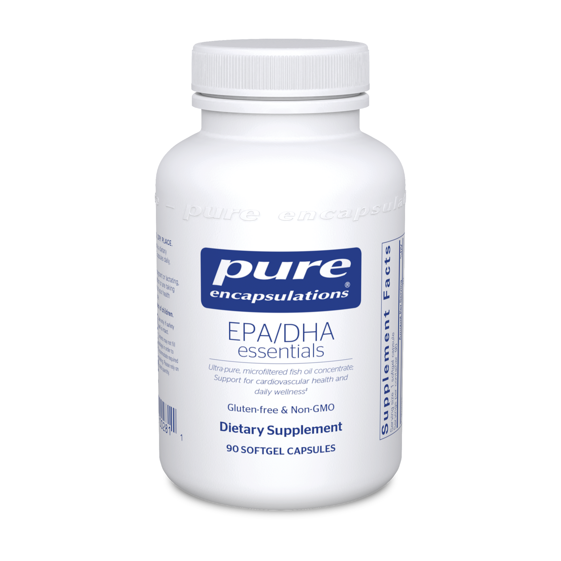 Ultra-pure, microfiltered fish oil concentrate; support for cardiovascular health and daily wellness* EPA and DHA from fish oil promote cardiovascular health by supporting healthy triglyceride and lipid metabolism, maintaining healthy blood flow, and supporting healthy platelet function. Fish oil is also important for optimal joint function. It maintains healthy prostaglandin and leukotriene production, which is important for maintaining connective tissue health and comfort. Furthermore, omega-3 fatty acids are important components of neuronal cell membranes and are essential to cognitive function. By supporting vascular health, fish oils promote oxygen and nutrient delivery to the brain. Studies suggest that healthy red blood cell membrane omega-3 fatty acid concentration is associated with emotional well-being. Both epidemiological and double-blind, placebo-controlled trials indicate that fish oil supports positive mood.* EPA/DHA essentials is an ultra-pure, molecularly distilled fish oil concentrate that has been tested for environmental contaminants (heavy metals, PCBs, dioxins and furans), microbial contaminants, and oxidation and rancidity. It contains well below the strict limits for these criteria as established by the Council for Responsible Nutrition (CRN), Europea Pharmacoepeia (EP) and U.S. Pharmacoepeia (USP).* Supports cardiovascular health* Helps to maintain a healthy blood flow* Made with molecularly distilled fish oil concentrate* May promote emotional well-being*