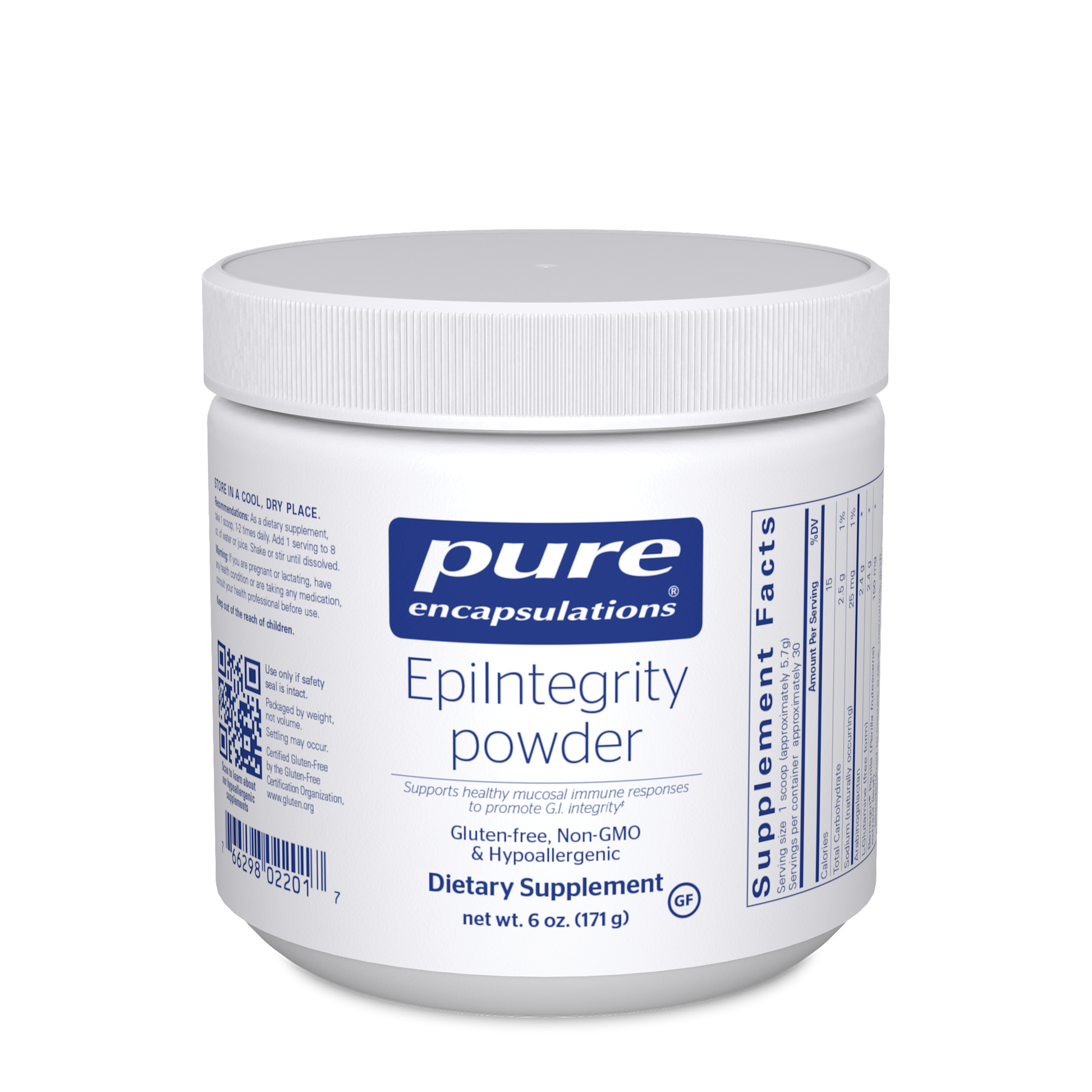EpiIntegrity powder is designed to promote healthy modulation of mucosal immune response to support gastrointestinal (G.I.) integrity and function. Th2 modulation may be indicated when addressing immune balance in the G.I. tract. L-glutamine is an essential fuel for enterocytes (the cells that line the small intestine and colon), supporting cellular renewal, glutathione production and healthy, everyday tissue repair, while promoting healthy villous function. Arabinogalactan is a prebiotic fiber found in high concentrations in North American larch trees. It has been shown to increase the concentration of beneficial bacteria, such as Bacteroidetes and Faecalibacterium prausnitzii. Beneficial microflora are crucial for proper gut associated lymphoid tissue (GALT) function and development. Research suggests higher levels of F. prausnitzii are associated with healthy cytokine balance and G.I. function. In clinical trials, arabinogalactan has been shown to promote immune cell function. In a randomized three-week trial involving healthy adults, arabinogalactan potentiated the innate immune system, supporting key first-line defense. Perilla supports cytokine homeostasis of the G.I. mucosal tissue. In a randomized, controlled trial involving 50 individuals, 150 mg of Benegut Perilla frutescens extract twice daily offered statistically significant support for G.I. comfort. Research suggests that perilla also helps maintain cytokine balance and stabilize mast cells. Astragalus promotes cytokine balance and supports macrophage, natural killer (NK) cell and T-cell activity. Adaptogens like astragalus support physiological and cellular homeostasis and have positive effects on immune function and antioxidant defenses. Deglycyrrhizinated licorice (DGL) maintains intestinal comfort by supporting the protective mucosal lining.* Offers a unique broad-spectrum combination to promote healthy modulation of mucosal immune response to support G.I. integrity and function* Provides 2.4 g L-glutamine and 2.4 g arabinogalactan per serving Great-tasting natural strawberry-lemonade flavored powder Made with hypoallergenic, vegan ingredients
