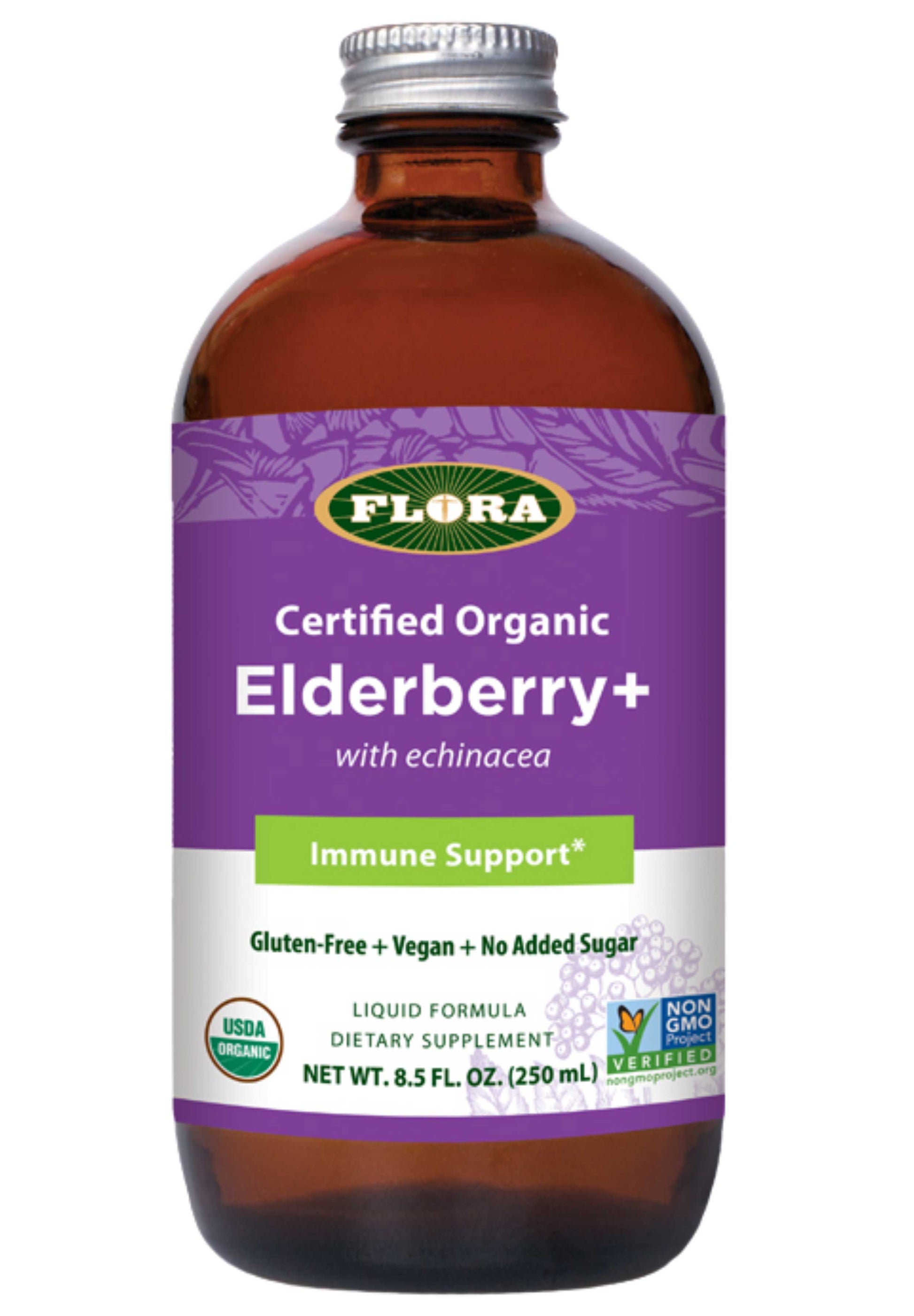 - Flora’s Elderberry+ is a delicious, organic blend of elderberry, echinacea, and licorice. It can be taken daily to maintain a healthy immune system or at the onset of symptoms.*