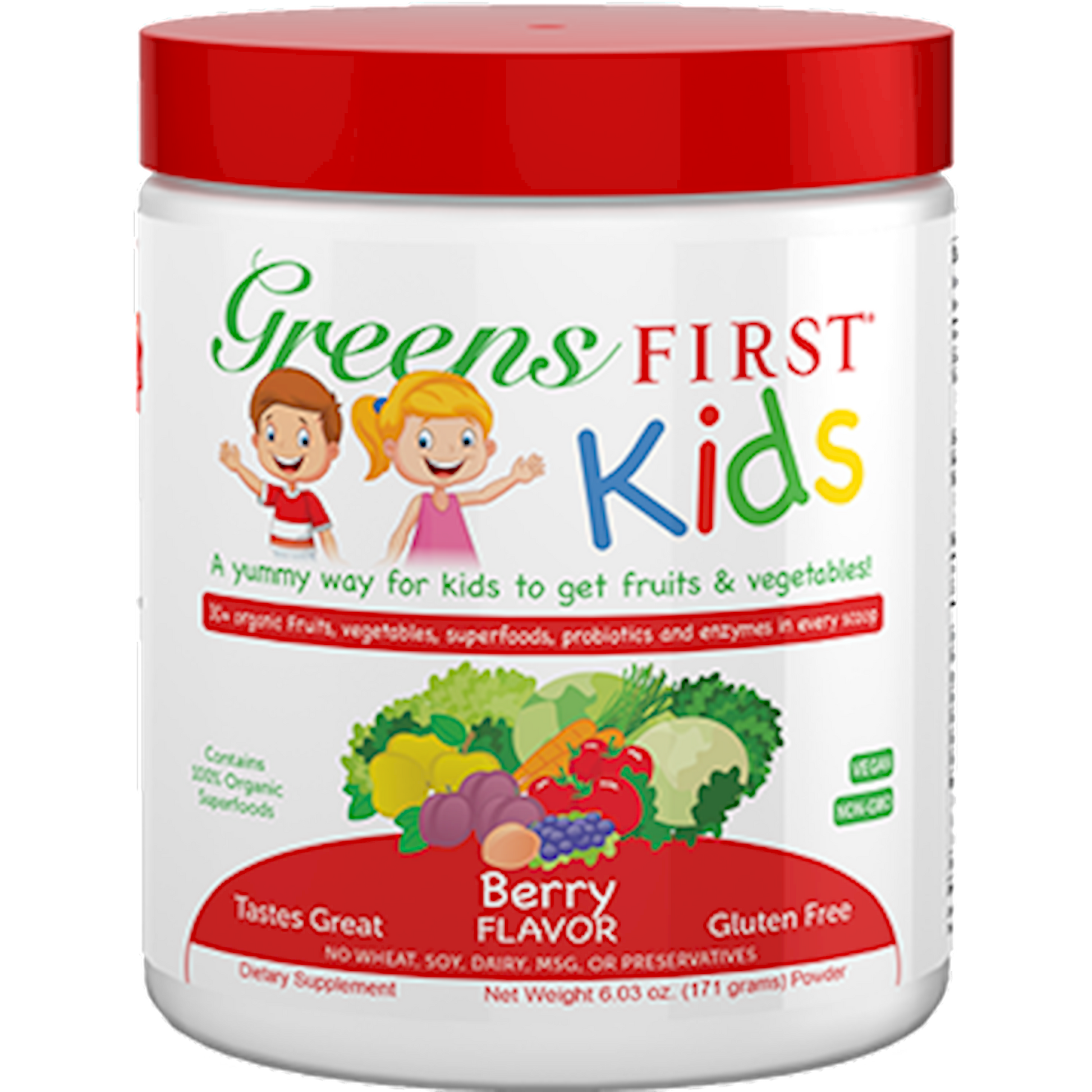 Serving Size: 1 Scoop Servings Per Container: 30 Disclaimer Amount Per Serving Calories 20 Calories from fat 5 Total Fat 1.5 g Saturated Fat 0.5 g Trans Fat g Cholesterol g Sodium 20 mg Total Carbohydrate 5 g Dietary Fiber 3 g Sugars 1 g Protein 2 g Organic Strawberry Fruit Powder 615 mg Fibergum Bio Seyal (Organic Acacia Gum Powder) 500 mg Organic Pineapple Fruit Powder 500 mg Organic Flax Seed Powder 462.5 mg Organic Beet Root Powder 400 mg Organic Apple Fruit Powder 355 mg Organic Vita Veggie Blend 350 mg Organic Broccoli Organic Broccoli Sprouts Organic Tomato Organic Carrot Organic Spinach Organic Kale Organic Carrot Root Powder 312.5 mg Organic Cranberry Fruit Powder 250 mg Organic Acerola Berry Powder 225 mg Enzyme Blend 200 mg Bromelain Papain Protease Amylase Lipase Cellulase Lactase Organic Plum Fruit Powder 137.5 mg Organic Pomegranate Fruit Powder 137.5 mg Organic Pear Fruit Powder 125 mg Organic Stevia Leaf Powder 120 mg Organic Mango Fruit Powder 112.5 mg Organic Orange Fruit Powder 100 mg Organic Papaya Fruit Powder 100 mg Organic Watermelon Fruit Powder 100 mg Organic Peach Fruit Powder 75 mg Organic Tomato Fruit Powder 75 mg Organic Cherry Fruit Powder 50 mg Organic Red Raspberry Fruit Powder 50 mg Organic Kiwi Fruit Powder 25 mg Organic Noni Fruit Powder 20 mg Probiotic Formula 12 mg 2 Billion CFU Bifidobacterium Longum Bifidobacterium Breve Bifidobacterium Bifdum Bifidobacterium Infantis Lactobacillus Acidophilus Lactobacillus Rhamnosus Lactobacillus Casei Lactobacillus Reuteri Organic Blueberry Fruit Powder 10 mg Organic Bilberry Fruit Powder 5 mg Other ingredients: Organic Strawberry Flavor, Organic Blueberry Flavor