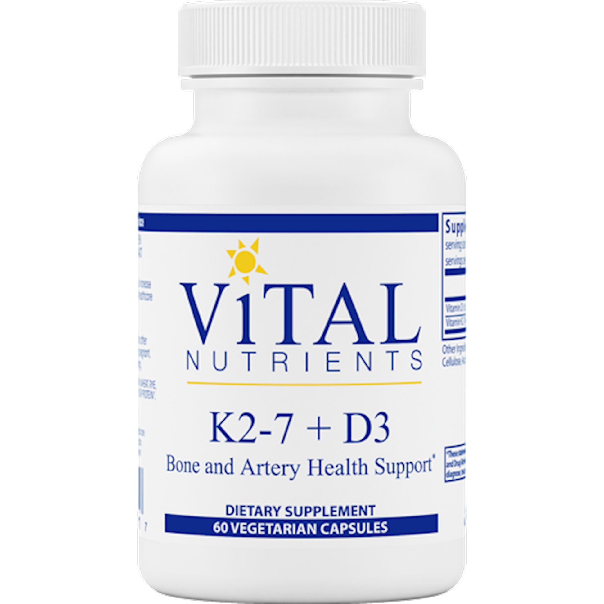 Synergistic support for bone health* Promotes healthy calcium metabolism* Helps maintain cardiovascular health* Vitamin D3 (cholecalciferol) and Vitamin K2-7 (menaquinone) work synergistically to help maintain bone health.* Vitamin D3 helps maintain healthy serum calcium levels by promoting intestinal absorption and reducing urinary excretion of calcium. Vitamin K2-7 supports healthy bone mineralization by acting as a cofactor in the carboxylation of osteocalcin, allowing calcium to bind to this protein in the extracellular matrix of bone.* Vitamin K2-7 also supports healthy cardiac and vascular function.* This form of Vitamin K concentrates in the tissues of the arteries, where it aids in carboxylation of Matrix Gla Protein to help maintain normal calcium metabolism and support healthy vascular elasticity.* Additionally vitamin K2 may help support healthy lipid levels and glucose metabolism.* Although frank vitamin K deficiency is rare, research suggests the Western diet may not contain sufficient Vita-min K2-7 to optimize carboxylation of Gla outside the liver.* Higher dietary intakes of K2 have been associated with healthy levels of arterial calcification and elasticity.* Compared to other forms of Vitamin K, Vitamin K2-7 has a longer half-life, resulting in more stable levels in the body.* For best absorption of these fat soluble vitamins, take with a mixed meal or some healthy dietary fat.*