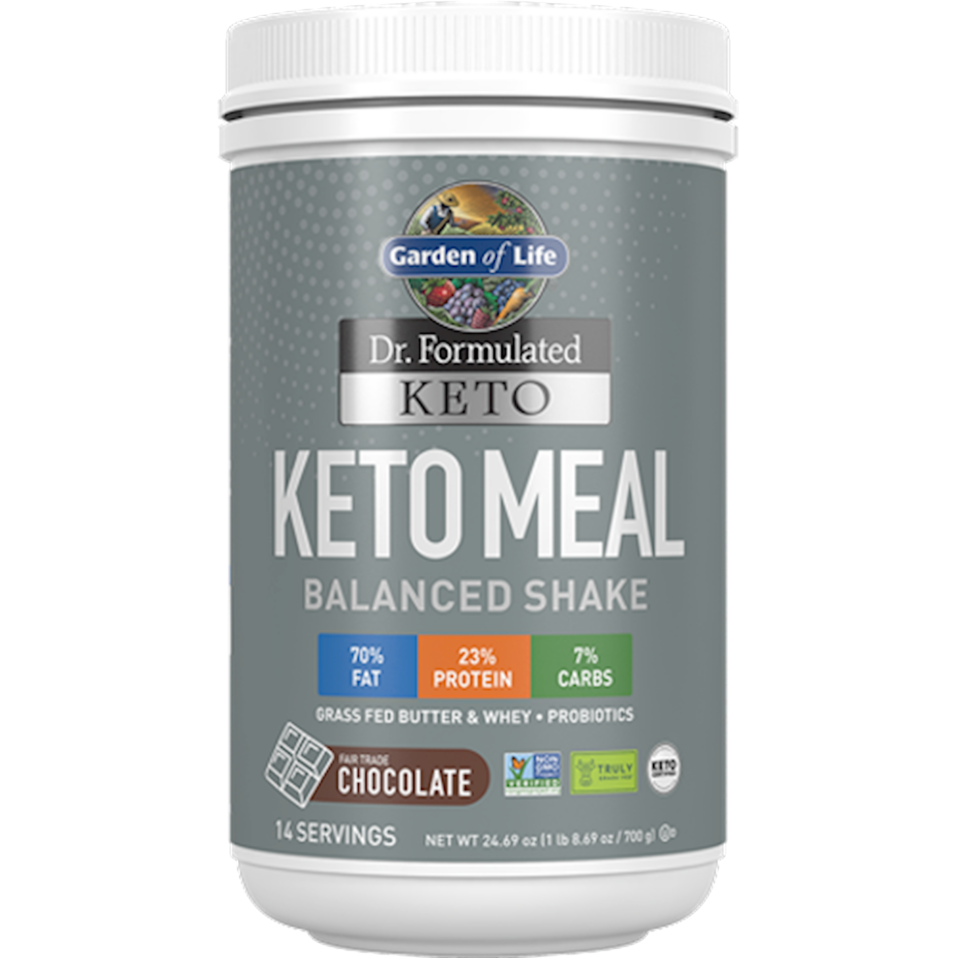 Keto Meal is perfect for those on a low-carb or ketogenic diet. It is expertly formulated with organic grass-fed butter, which is clean fuel for the brain and body.* Garden of Life's Truly Grass Fed whey protein means no antibiotics and no rBST or rBGH. Weve taken the math out of Keto by providing a meal replacement with the ratios of fat to protein to carbs that you are looking for. Available in delicious chocolate and vanilla organic flavors, Keto Meal is great in shakes, smoothies and also in baking. David Perlmutter, M.D. makes following a Keto Diet easy and delicious with this new line of products from Garden of Life. The Dr. Formulated Keto line is specifically crafted to help those who are seeking to enter into ketosis or stick to a low-carbohydrate diet for weight loss and health purposes. This new Keto Line of products is fully transparent, compliant to the keto guidelines and designed to be convenient for anyone who lives a busy lifestyle. All products in the Dr. Formulated Keto line are Keto Certified, Paleo Friendly Certified, and clean: Non-GMO Project Verified and Truly Grass Fed. Garden of Life also have taken the math out of the equation for you by providing the correct mix of fat, protein, and carbohydrates so you can follow your Keto diet more easily. Keto Meal Balanced Shake Benefits: Protein from Truly Grass Fed Whey Proteinno rBST, rBGH & antibiotic-free Use in shakes, smoothies and in baking Two delicious flavorsChocolate & Vanilla 1.5 Billion CFU Probiotics to support digestion*