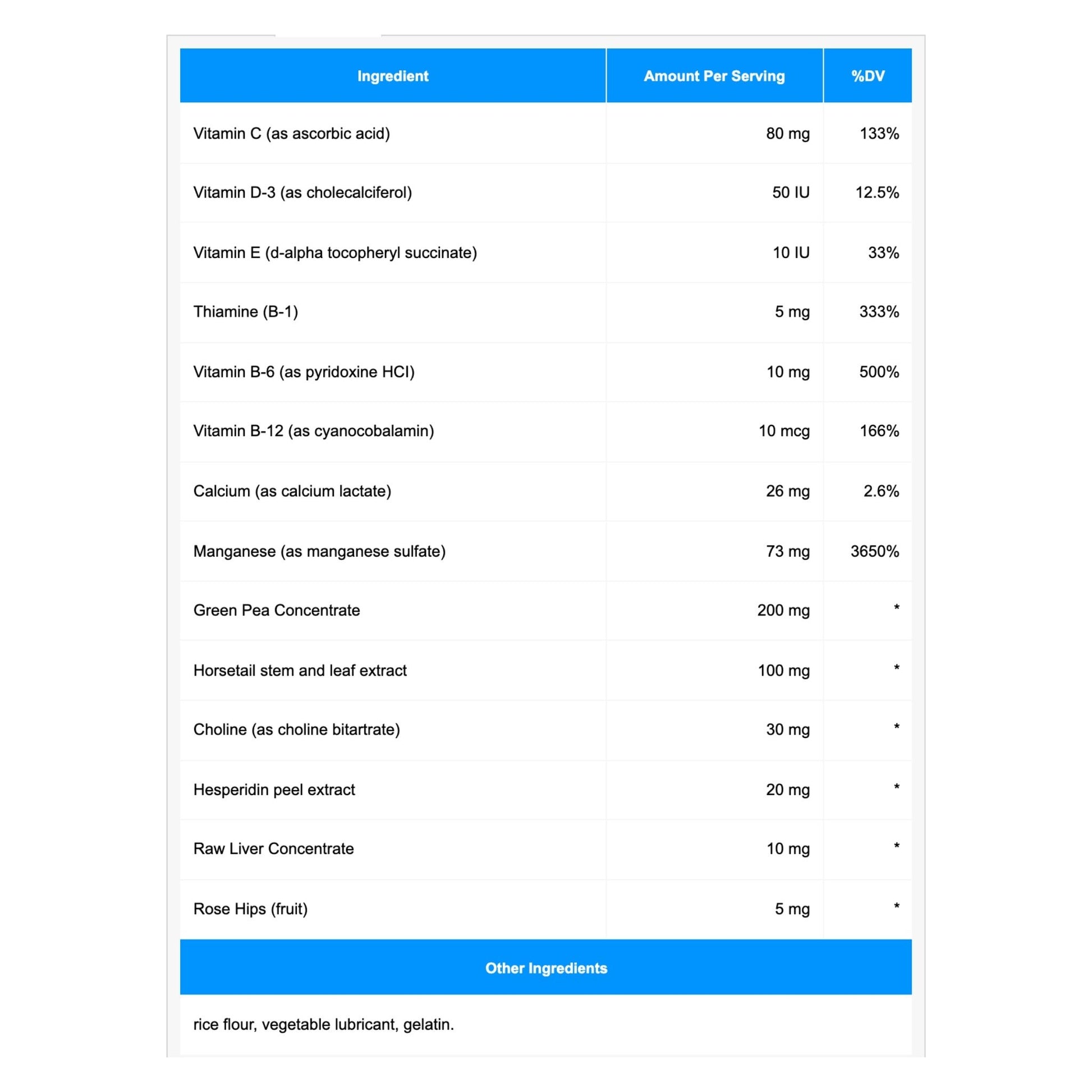 Serving Size: 1 Capsule Servings Per Container: 80 Disclaimer Amount Per Serving Vitamin C (ascorbic acid) 80 mg Vitamin D-3 (cholecalciferol) 50 IU Vitamin E (d-alpha tocopheryl succinate) 10 IU Thiamin HCl (vitamin B-1) 5 mg Vitamin B-6 (pyridoxine HCl) 10 mg Vitamin B-12 (cyanocobalamin) 10 mcg Elemental Calcium 26 mg From Calcium Lactate 175 mg Elemental Manganese 73 mg From Manganese Sulfate 200 mg Choline Bitartrate 30 mg Bioflavonoids 20 mg Horsetail 100 mg Rose Hips 5 mg Green Pea Concentrate 200 mg Raw Liver Concentrate 10 mg Other ingredients: cellulose, stearic acid