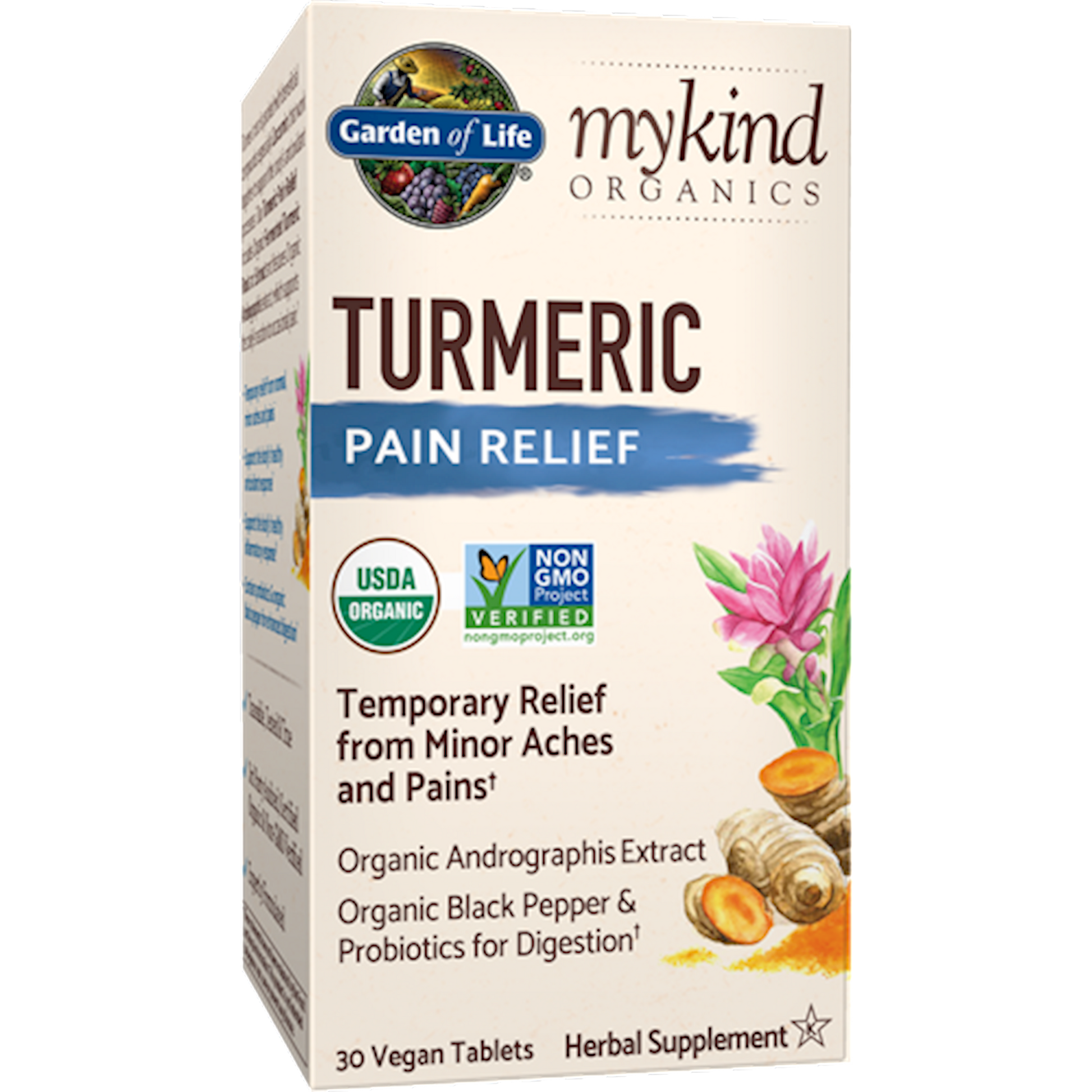 Turmeric root is packed with beneficial compounds, especially curcumin, that work together to support the bodys antioxidant processes.* Garden of Life's Turmeric Pain Relief includes Certified USDA Organic and Non-GMO Project Verified fermented turmeric root and extract and features clinically studied Andrographis extract (Paractin), which supports the bodys reaction to occasional pain.* mykind Organics Turmeric Pain Reliefand the entire line of Herbalsis Certified USDA Organic and Non-GMO Project Verified ensuring these herbals are clean and grown without toxic pesticides, herbicides or fungicides. Garden of Life also use an Organic, Non-GMO Verified extraction method so no harsh chemicals or conventional corn alcohol are used. Real to the Rootmykind Organics Herbal Supplements. mykind Organics Turmeric Pain Relief Benefits: Temporary relief from normal, minor aches & pains* Supports the bodys healthy antioxidant response* Supports the bodys healthy inflammatory response* Contains probiotics & organic black pepper for enhanced digestion* Certified USDA Organic & Non-GMO Project Verified NSF Certified Gluten-Free & Certified Vegan