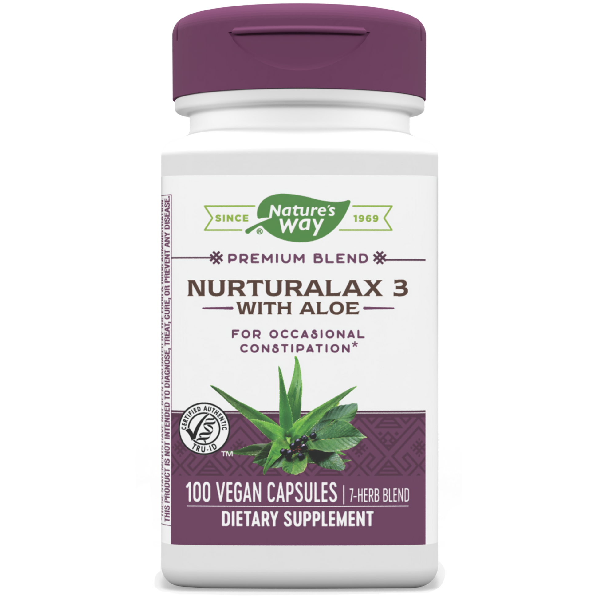 A proprietary blend of Aloe ferox, Butternut, Fennel, Ginger, Cascara Sagrada, Raspberry, & Peppermint. Nurturalax 3 100 vcaps