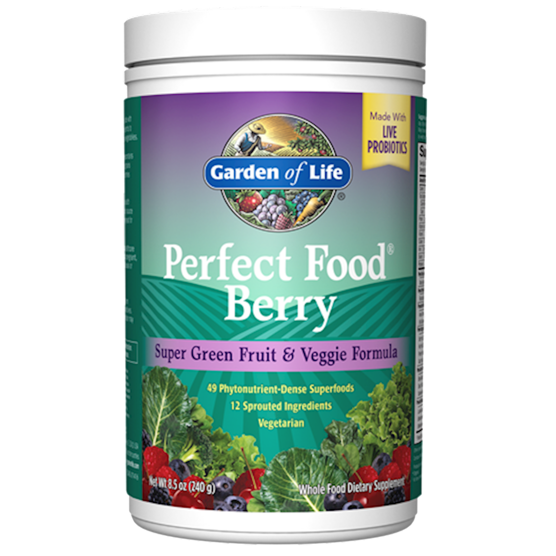 Perfect Food Berry Super Green Fruit & Veggie Formula was created as an option for green drink lovers who wish to consume fruits and veggies all in one superfood drink. Packed with 49 phytonutrient-dense superfoods and 12 sprouted ingredients, Perfect Food Berry Super Green Fruit & Veggie Formula adds great value to a healthy diet or supplement program. Perfect Food Berry is different from the other Perfect Food formulas in that it includes an additional Whole Food Antioxidant blend that contains 5 freeze-dried whole fruits: strawberry, tart cherry, blueberry, blackberry and raspberry, in addition to acerola cherry and citrus bioflavonoids. Perfect Food Berry Super Green Fruit & Veggie Formula is made with 49 nutrient-rich and whole food based ingredients to ensure your body receives the nutritional benefits of fruits and vegetables. Providing 4,340mg of greens per serving, Perfect Food Berry supplement contains 21 vegetable juices, 12 fermented sprouted grains and legumes, 8 marine plants, and 7 fruits and berries, 5 of which have been freeze-dried to maintain nutrient delivery and fresh taste. An excellent source of natural antioxidants including vitamins A and C, Perfect Food Berry features a fruit blend of strawberry, raspberry, blueberry, blackberry and tart cherry that contributes to an ORAC value of 2,000 TE per serving, approximately 20% of the antioxidant value of a healthy diet with the daily recommended 5 servings of fruits and vegetables. In addition, Perfect Food Berry includes a Protein Mineral Matrix of spirulina, chlorella and other marine superfoods, and delivers one billion live cell count per serving, with 10 probiotic strains to support digestive health.* Select ingredients are produced through the Garden of Life proprietary Poten-Zyme fermentation process to make the nutrients more available to the body. CFU count per serving at time of manufacture Perfect Food Berry Super Green Fruit & Veggie Formula Benefits: 4,340mg of greens per serving from 49 phytonutrient-dense superfoods and 12 sprouted ingredients* AntioxidantsORAC value of 2,000 TE per serving* An ideal product for those who dont get enough green foods* One billion live cell count per serving, with 10 probiotic strains to support healthy digestion* No Artificial Colors, Flavors or Preservatives Perfect Food Berrya whole food supplement blend with more greens per serving than other green food formulas.