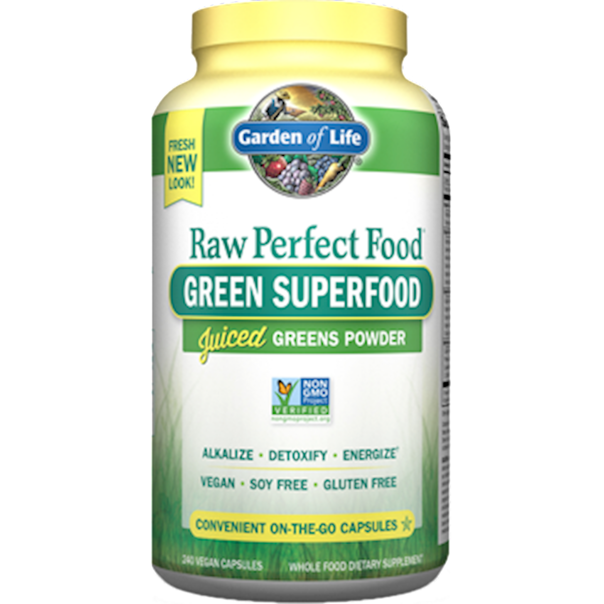 Raw Perfect Food is the only RAW Vegan Green Super Food available in capsules and Certified USDA Organic powder. Both versions are packed with the power of 34 nutrient-dense, RAW, organically grown greens, sprouts and vegetable juices for the RAW energy you need every day.* Perfect Food RAW organic grasses are juiced and cold-temperature dried immediately at the farm within an hour of harvesting, locking in the concentrated nutrition everyone looks for in a greens supplement. Capture the power of the sun with Raw Perfect Food. Packed with the energizing power of 34 nutrient-dense, RAW, organic greens, sprouts and vegetable juices, Raw Perfect Food provides foundational nutrition your body craves to support healthy digestion, detoxification, a healthy immune system, already healthy blood sugar levels in the normal range and metabolism.* Raw Perfect Food is a RAW, organic, whole food nutrition supplement providing naturally occurring chlorophyll, antioxidants, enzymes, amino acids, essential fatty acids and dozens of phytonutrients. Bursting with prebiotics, probiotics and enzymes to support healthy digestion and nutrient absorption,* Raw Perfect Food is the convenient, delicious way to get your veggie juice every day. Raw Perfect Food puts the GREEN in greens* with young cereal grass juices such as barley, alfalfa, oat, wheat and kamutsome of the most nutrient-dense foods on the planet. Garden of Life Certified Organic greens are sustainably grown by their family famers in the USA. They harvest before the grain buds (to prevent gluten from forming) and then juice at the farm immediately after harvest. Garden of Life's juice is gently low temperature dried and powdered onsite locking in its nutritionally dense, organic goodness. The end result is highly bioavailable and many times more concentrated in nutrients, including chlorophyll, than whole leaf grass powders. Raw Perfect Food Green Superfood Benefits: RAW energy.* Supports healthy digestion.* Supports healthy metabolism.* Helps to support alkalizing and detoxifying.* Supports healthy immune function.* Helps to support healthy blood sugar levels already in the normal range.* Raw Perfect Food - Raw organic green super food from freshly juiced greens in convenient capsules.