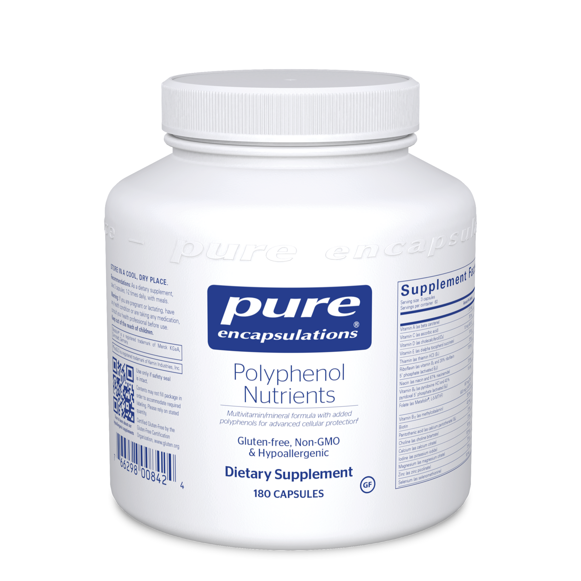 Multivitamin/mineral formula with added polyphenols for advanced cellular protection* Indications: Enhanced antioxidant support* Wide range support for cellular, macular, cognitive, skin, heart, nerve, and liver health* Vitamin/Mineral Distinctions: With choline and inositol for comprehensive B-complex support* Special Features: Cell Health Polyphenols* Includes polyphenols from blueberry, grape seed, olive fruit, pomegranate, green tea and quercetin for optimal cell health. Alpha lipoic acid and n-acetyl-l-cysteine act as complementary cofactors for added antioxidant protection.* MacularSynergy Complex* Supports the integrity of the macula and retina with lutein and zeaxanthin. Synergistic cofactors include vitamin C, vitamin E, zinc and carotenoids.* Promotes enhanced cellular protection* Provides broad-spectrum nutritional support* Made with hypoallergenic ingredients Polyphenol Nutrients is a multivitamin and mineral formula for overall health and cellular protection.