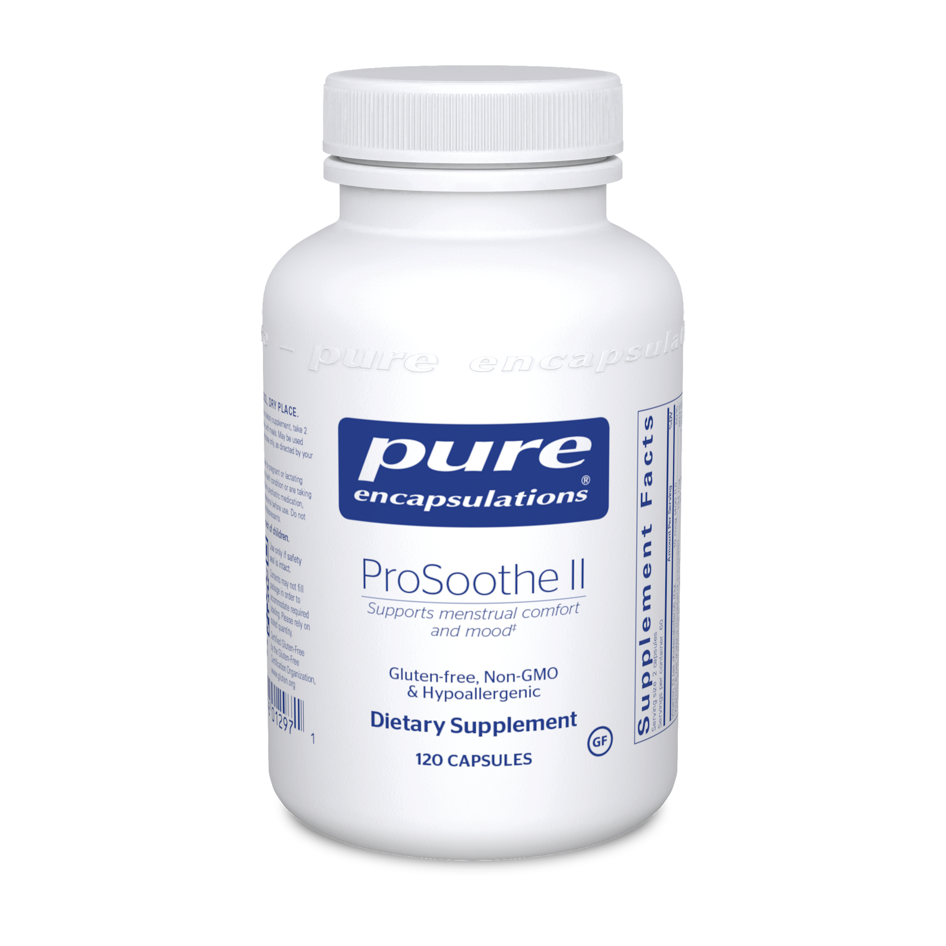 Supports menstrual comfort and mood and helps lessen fatigue and cravings* ProSoothe II provides a comprehensive nutrient and botanical approach to support mood, cravings, cramps and bloating associated with the menstrual cycle. Calcium plays a role in healthy smooth muscle function and menstrual comfort. Vitamin D has similar effects, attributed to its ability to promote healthy calcium levels, cyclic hormone function and neurotransmitter activity. Healthy intracellular magnesium levels have been associated with maintaining positive mood during the luteal phase. Magnesium also plays an important role in nervous system sensitivity, providing support for muscle comfort, breast comfort and emotional well-being associated with the menstrual cycle. Studies indicate the positive effect of vitamin B6 on premenstrual mood as well as its crucial role in enhancing the effect of magnesium. Vitamin E research suggests that it helps lessen breast tenderness as well as nervous tension and fatigue associated with the menstrual cycle. Traditionally used and clinically studied, chaste tree provides significant beneficial support for the hypothalamus and pituitary via its balancing effects. Relora may help diminish stress-related sugary snack cravings and support emotional wellness while rhodiola supports energy and mental function.* Supports menstrual comfort and mood* Helps lessen fatigue and cravings* Made with hypoallergenic, vegan ingredients