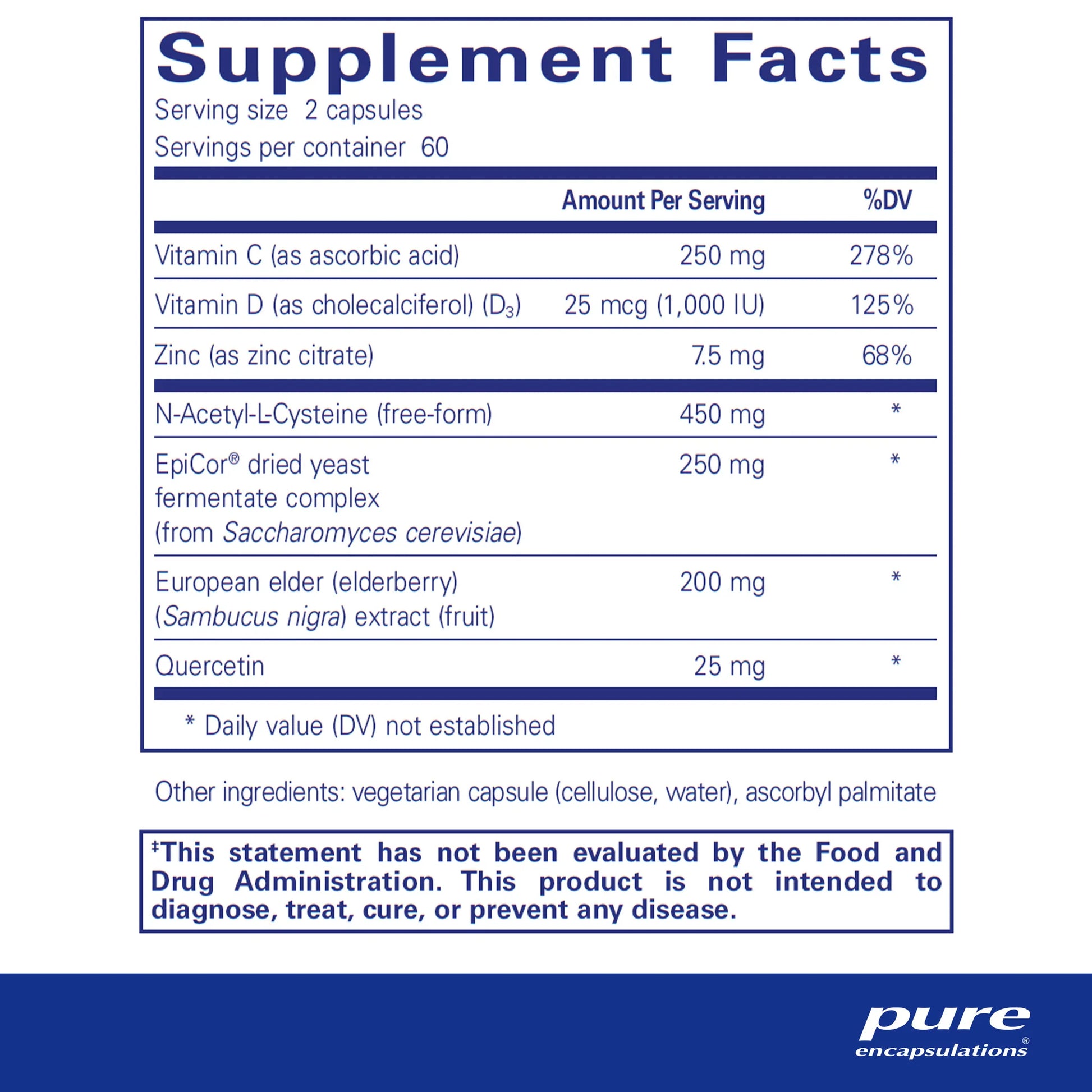Serving Size: 4 Capsule Servings Per Container: 30 Disclaimer Amount Per Serving Vitamin C (ascorbyl palmitate) 40 mg Vitamin C (ascorbic acid) 500 mg Vitamin D3 2000 IU Zinc (citrate) 15 mg N-acetyl-l-cysteine (free-form) 900 mg EpiCor dried yeast fermentate complex (from Saccharomyces cerevisiae) 500 mg Elderberry extract (fruit) 400 mg Quercetin 50 mg Other ingredients: Vegetable Capsule