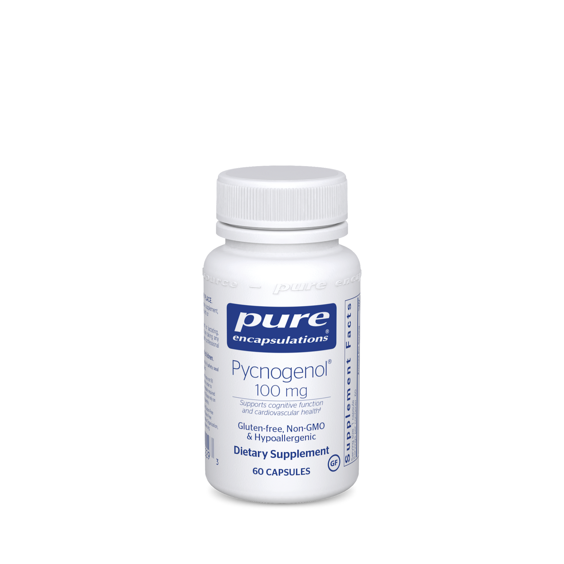 Supports cognitive function and cardiovascular health* Pycnogenol originally denoted all proanthocyanidin extracts, regardless of source. However, it now refers specifically to maritime pine bark. The mixture of proanthocyanidins in pine bark supports vascular endothelial integrity by stabilizing collagenous membranes. It also promotes vascular function by modulating nitric oxide levels. In addition to facilitating vitamin C regeneration and preserving vitamin E, Pycnogenol is a hydroxyl and superoxide radical scavenger. Collectively, these actions promote the health of blood vessels.* Antioxidant support for vascular health* Supports vascular integrity* Made with hypoallergenic, vegan ingredients