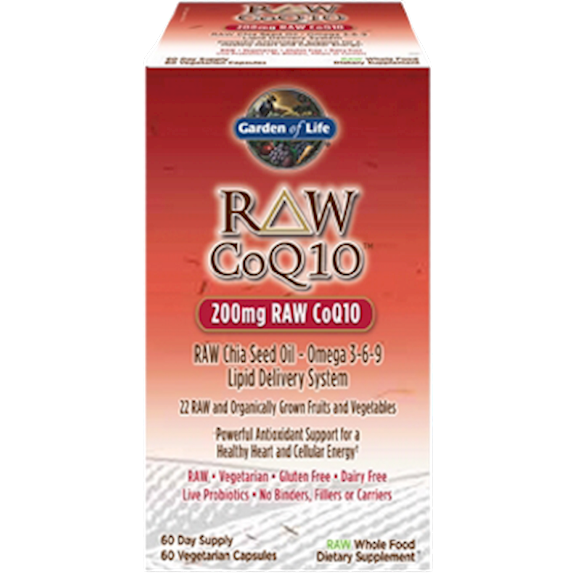 RAW CoQ10 delivers 200mg of the food form of CoQ10 in a base of RAW cold-pressed chia seed oil in just one capsule daily. This unique lipid delivery system is free of artificial ingredients and ensures that this important fat-soluble antioxidant is well absorbed.* Garden of Life RAW CoQ10 is a powerful formula that delivers 200mg of RAW CoQ10 per serving. Fat soluble CoQ10 features a unique lipid delivery systema RAW, cold-pressed chia seed oil omega 3-6-9 matrixfor high absorption.* CoQ10 is a fat-soluble, antioxidant and electron-transporting coenzyme that is well known as an effective scavenger of oxygen free radicals.* RAW means no high heat, synthetic binders, fillers, artificial flavors, sweeteners, colors or additives commonly used intablets. RAW CoQ10 is whole foodRAW Food-Created Nutrients blended in a base of organically grown fruits and vegetables together with food cofactors. RAW CoQ10 Benefits: Supports cardiovascular function and heart health* Offers powerful antioxidant supportagainst free radicals* Has live probiotics to support healthy digestion* No Binders, Fillers, Artificial Flavors or Sweeteners RAW CoQ10 a powerful formula that delivers 200mg of RAW CoQ10 per serving, featuring a unique lipid delivery systema RAW, cold-pressed chia seed oil omega 3-6-9 matrixfor high absorption.*