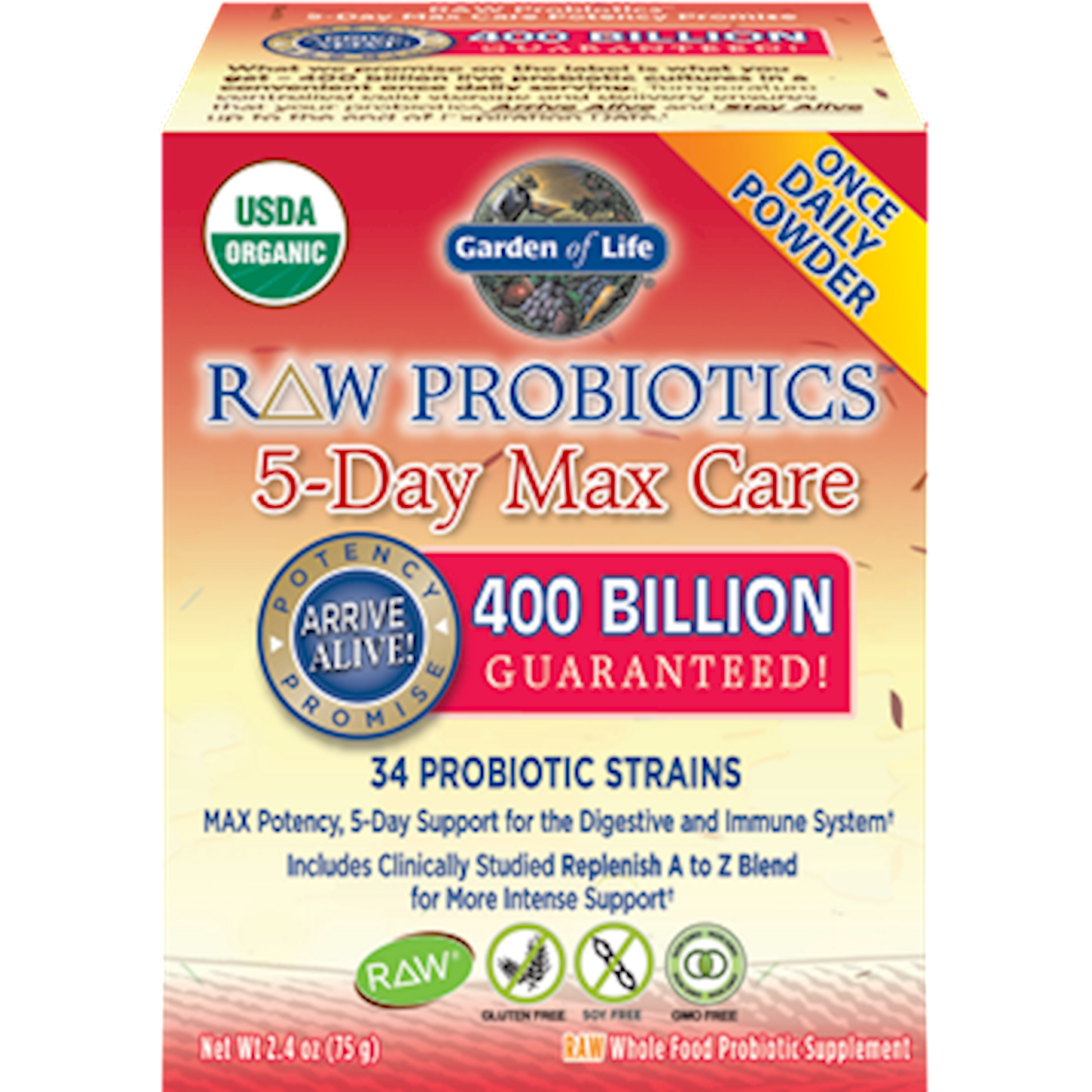 RAW Probiotics is a unique line of high-potency, RAW, whole food probiotics that are age- and gender-specific. Unlike isolated strains of probiotics, RAW Probiotics offers all the benefits of a true food probiotic with a record-setting 30+ probiotic strains. So, its not just isolated bacteria in a pill; RAW Probiotics is a whole-food probiotic that emulates eating fermented food. Made with mainly Bulgarian yogurt concentrate, Wild European kefir grains and scobies, and concentrated clinically studied probiotics strains, RAW Probiotics is created below 40 F and 30% humidity so that what you see on the label is what you get in the bottle. Many factors can compromise your bodys defenses, including the overuse of medications, stress, your environment, and even normal aging, resulting in the loss of beneficial Bifidobacterium. RAW Probiotics 5-Day Max Care is a unique High-Bifido formula that includes the clinically studied Replenish A to Z Blend, making it your ultimate complementary probiotic to achieve balancehelping you repopulate your gastrointestinal tract with good bacteria.* At Expiration Date under recommended storage conditions. Best if refrigerated. Store in a dry place at 71F (22C) or below. Raw Probiotics 5-Day Max Care Powder Benefits: Max cleansing support with 34 naturally diverse whole food strains to replenish beneficial bacteria lost during use of a cleansing program* Max immune system support by supporting gut-related immune system function* Offers max Bifido supporta more intense, short-term probiotic to help replenish beneficial bacteria in the gut* Delivers max prebiotic support with prebiotic, RAW Organic inulin plus 14 digestion-supporting enzymes* Has RAW Organic banana to help soothe the stomach and provide a light, pleasant taste* Arrive Alive! Potency Promise No Binders, Fillers, Carriers, Artificial Colors, Flavors or Preservatives RAW Probiotics5-Day Max Carea unique High-Bifido formula that includes the clinically studied Replenish A to Z Blend, making it your ultimate complementary probiotic to help support balance and repopulate your gastrointestinal tract with good bacteria.*