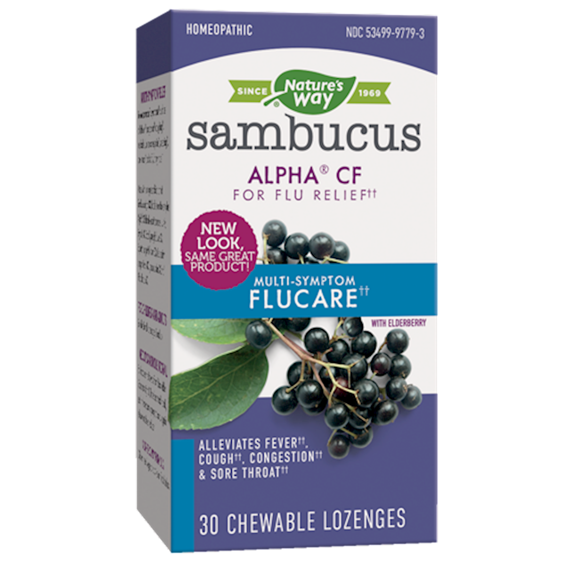 Serving Size: 1 Lozenge Servings Per Container: 30 Disclaimer Sambucus Alpha CF FluCare Homeopathic Formula Relieves common flu symptoms such as chills/fever, congestion, coughing, headache, minor aches/pains, sneezing, sore throat, and stuffy/runny nose Made with a unique combination of Sambucus nigra 3X (black elder flower) plus Alpha CF blend: Aconitum napellus 4X, Bryonia 4X, Eucalyptus globulus 2X, Eupatorium perfoliatum 6X, Gelsemium sempervirens 4X, Ipecacuanha 3X and Phosphorus 6X. Suitable for children ages 6 and up. Uses: Temporarily relieves common flu symptoms: chills/fever congestion cough headache hoarseness runny nose sneezing sore throat stuffy nose minor aches/pains Drug Facts: Active Ingredients (212 mg in each chewable lozenge) / Purpose Aconitum napellus 4X, Eucalyptus globulus 2X, Sambucus nigra 3X / Pain reliever and fever reducer Bryonia 4X, Eupatorium perfoliatum 6X / Cough suppressant Gelsemium sempervirens 4X, Phosphorus 6X / Sneezing, runny nose Ipecacuanha 3X / Nasal decongestant Inactive Ingredients: elderberry extract, fructose, lactose monohydrate, magnesium stearate, malic acid, mannitol, natural flavor, silica, sorbitol, sucrose