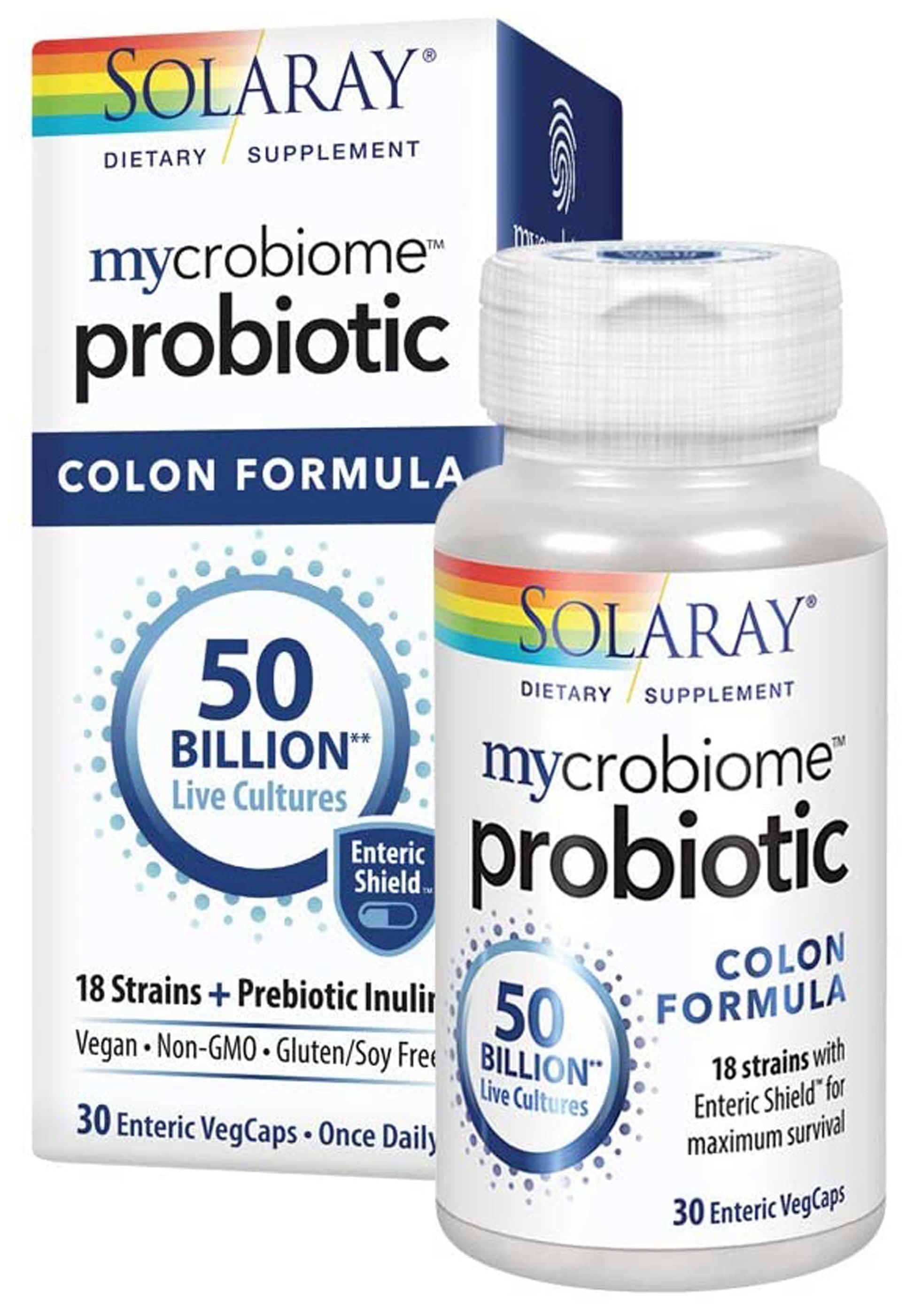 - Solaray Mycrobiome Probiotic Colon Formula is uniquely formulated to support colon health, elimination, digestive and immune function containing 50 billion CFU of 18 probiotic strains, plus prebiotic inulin.
