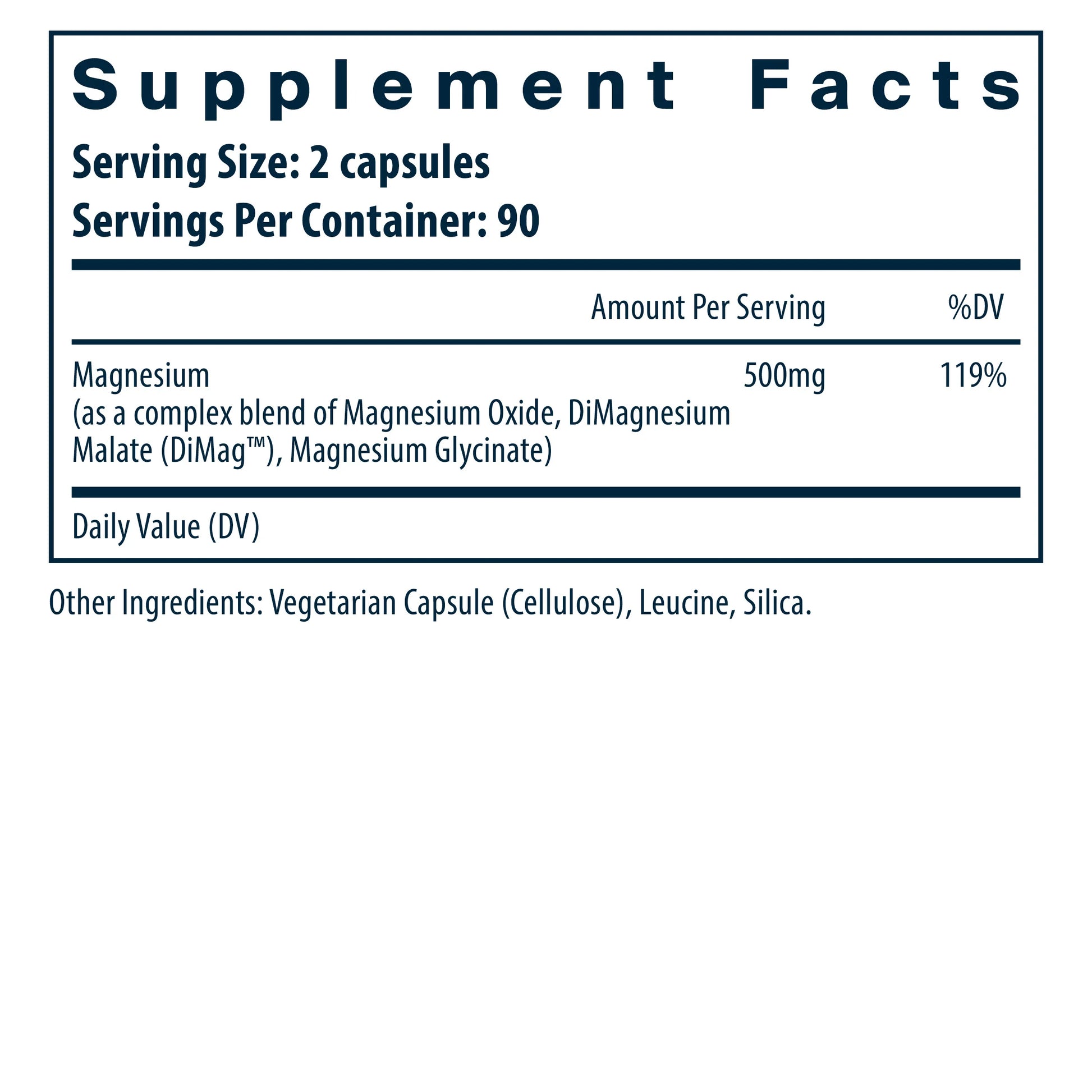 Serving Size: 2 Vegetable Capsule Servings Per Container: 45 Disclaimer Amount Per Serving Magnesium ( 10% as magnesium glycinate, 30% as dimagnesium malate, 60% as magnesium oxide) 500 mg 119% Other ingredients: Vegetable cellulose capsule, Leucine, Magnesium silicate, *Albion Minerals