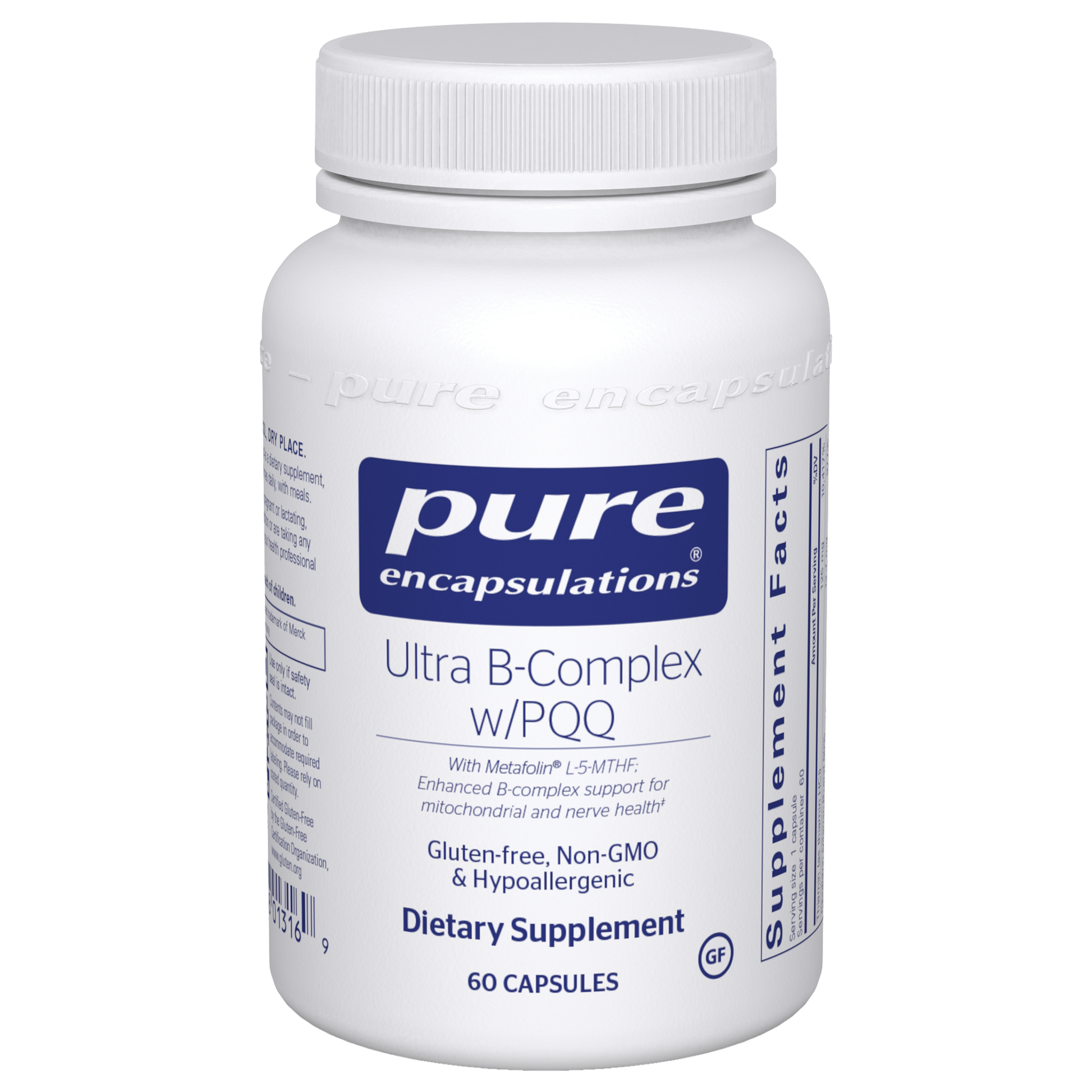 Enhanced B-complex support for mitochondrial and nerve health* Ultra B-Complex w/PQQ combines B-complex vitamins with PQQ for unique support of mitochondrial bioenergetics and function. The B-complex vitamins are essential to basal mitochondrial function as metabolic coenzymes and methyl donors while PQQ provides novel B-vitamin like activity and advanced antioxidant support, in part by activation of key genetic transcription factors. Alpha lipoic acid provides additional support for mitochondrial energy utilization and combined with luteolin, offers enhanced nervous system antioxidant activity.* Thiamin and niacin support healthy neuron cell longevity, neuronal membrane function, and impulse conduction * L-5-MTHF, methylcobalamin and vitamin B6 support neuronal health as methylation cofactors in myelin and neurotransmitter biosynthesis * PQQ is a novel B vitamin-like cofactor that encourages mitochondrial biogenesis * Alpha lipoic acid promotes mitochondrial function, neuron membrane integrity, and antioxidant protection * Luteolin maintains healthy macrophage activity and gene expression of the nervous system * Supports mitochondrial and nerve health* Promotes mitochondrial function* Made with hypoallergenic, vegetarian ingredients