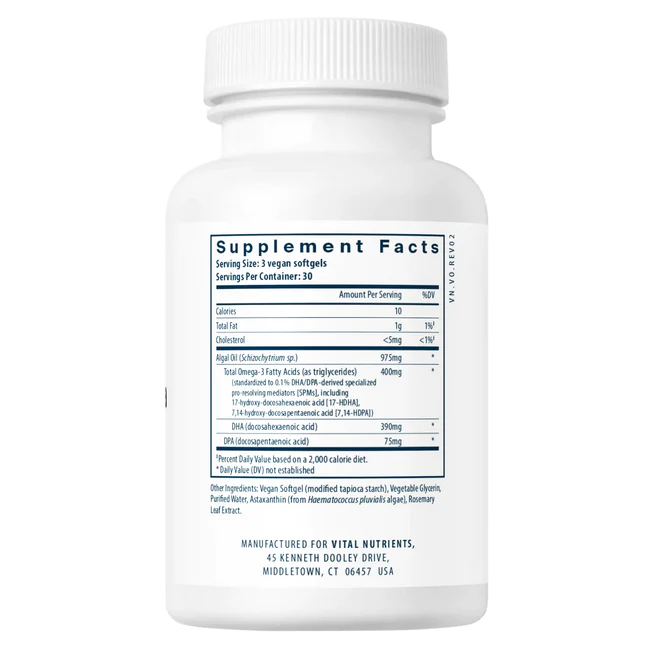 Our Vegan Fish Oil provides 400mg of omega 3 from sustainably sourced, non-GMO, plant-based algal (algae) oil concentrate plus specialized pro-resolving mediators (SPMs). Also known as resolvins, SPMs work with DHA and DPA to provide up to 5X more activity than traditional omega supplements to support activated immune system responses, cardiovascular health, and cognitive focus.