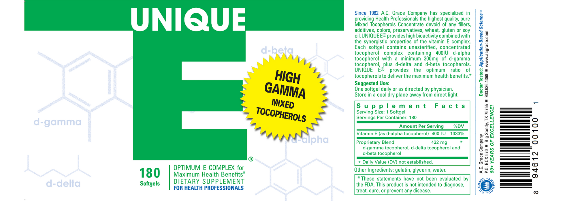 Since 1962, the A.C. Grace Company has been a pioneer in the research and development of Vitamin E products, providing the highest quality tocopherol and tocotrienol concentrates, devoid of fillers, additives, colors, preservatives, wheat, gluten or soy oil, as Nature intended. UNIQUE E® provides the high bioactivity combined with the synergistic properties of the vitamin E complex.