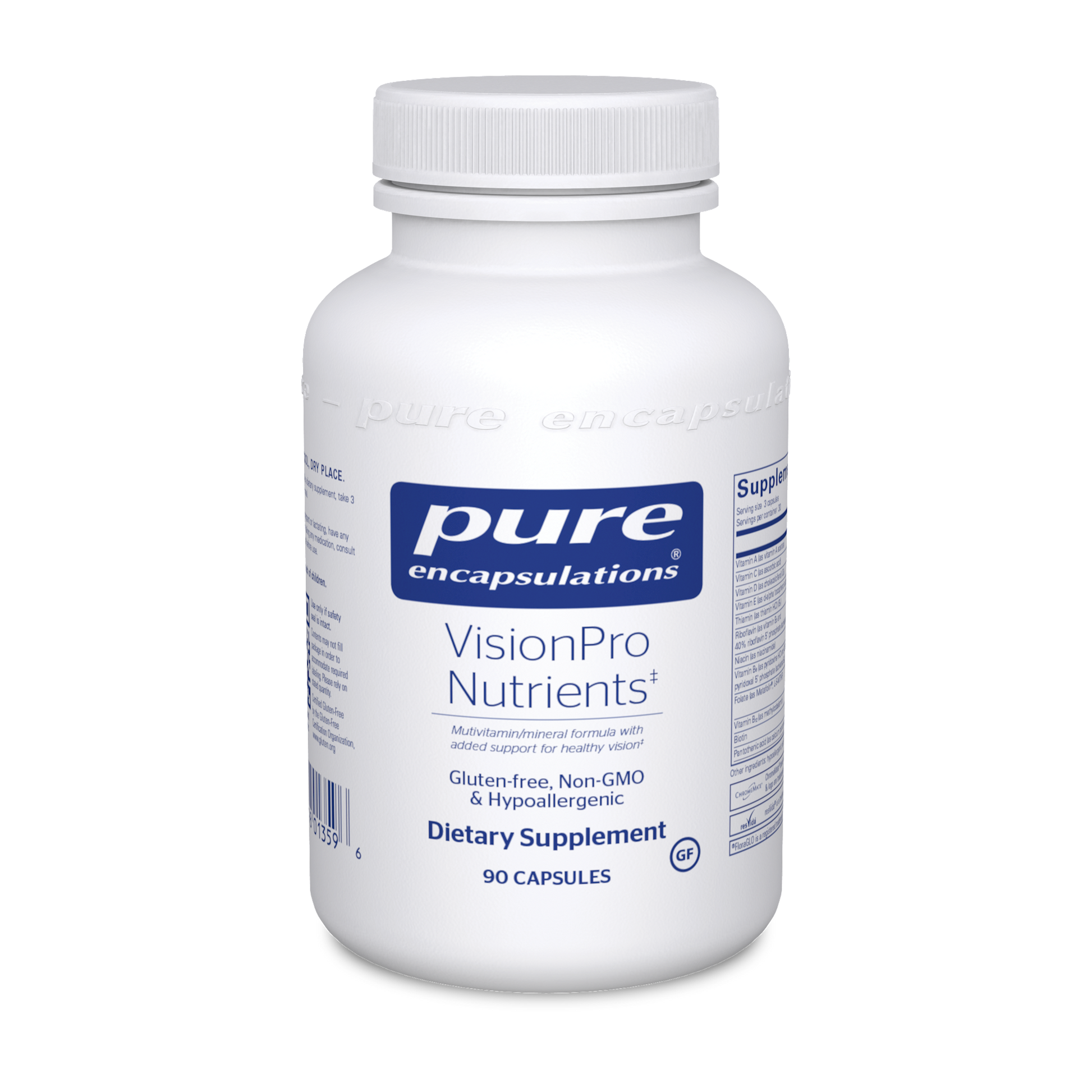 Comprehensive multivitamin/mineral complex for maintaining healthy vision* Can be combined with VisionPro EPA/DHA/GLA* to support natural tear production and tear film integrity in normally functioning eyes.* Indications: Men and women ages 18 and over Vitamin Distinctions: Clinically-researched levels of vitamin C, vitamin E, zinc and copper in highly bioavailable forms to support healthy vision and eye integrity* Contains 750 mcg (2,500 IU) of vitamin A per serving to support night vision and healthy tear production* Provides Metafolin L-5-methyltetrahydrofolate (L-5-MTHF), the naturally occurring, universally metabolized form of folate Special Features: Convenient three capsule per-day dosing Helps maintain macular and retinal health with 10 mg lutein, 2 mg zeaxanthin and 1 mg lycopene per serving* Supports visual function and healthy photoreceptor activity with taurine, alpha lipoic acid and resveratrol* Supports eye health* Helps maintain macular and retinal health* Made with hypoallergenic, vegetarian ingredients