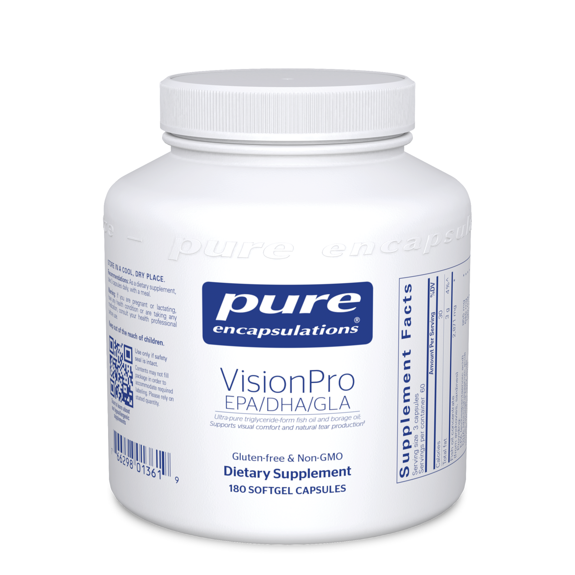 Ultra-pure triglyceride-form fish oil and borage oil to support visual comfort and natural tear production* VisionPro EPA/DHA/GLA supports natural tear production, healthy tear film composition and retention of eye moisture. A cross-sectional study of 32,470 women demonstrated a significant association between omega-3 fatty acid intake and ocular surface hydration. Several randomized controlled clinical trials have indicated that fish oils provide significant support for healthy tear function and associated visual comfort scores. Specifically, EPA and DHA support the coating of fluid that covers the eyes. These omega-3 fatty acids are incorporated into the lipid layer of the eye to maintain its fluidity and viscosity. By supporting the functional properties of the lipid layer, EPA and DHA promote retention of water in the underlying aqueous layer. EPA and DHA also promote healthy prostaglandin and cytokine balance to help protect the secretory function of the lacrimal glands. In addition, VisionPro EPA/DHA/GLA provides 75 mg GLA per serving from cold-pressed borage oil. Several studies have demonstrated that GLA-rich oils provide unique support for mucin production, prostaglandin balance and healthy tear film characteristics.* Promotes natural tear production* Supports visual comfort* Convenient soft gel capsule for easy dispensing