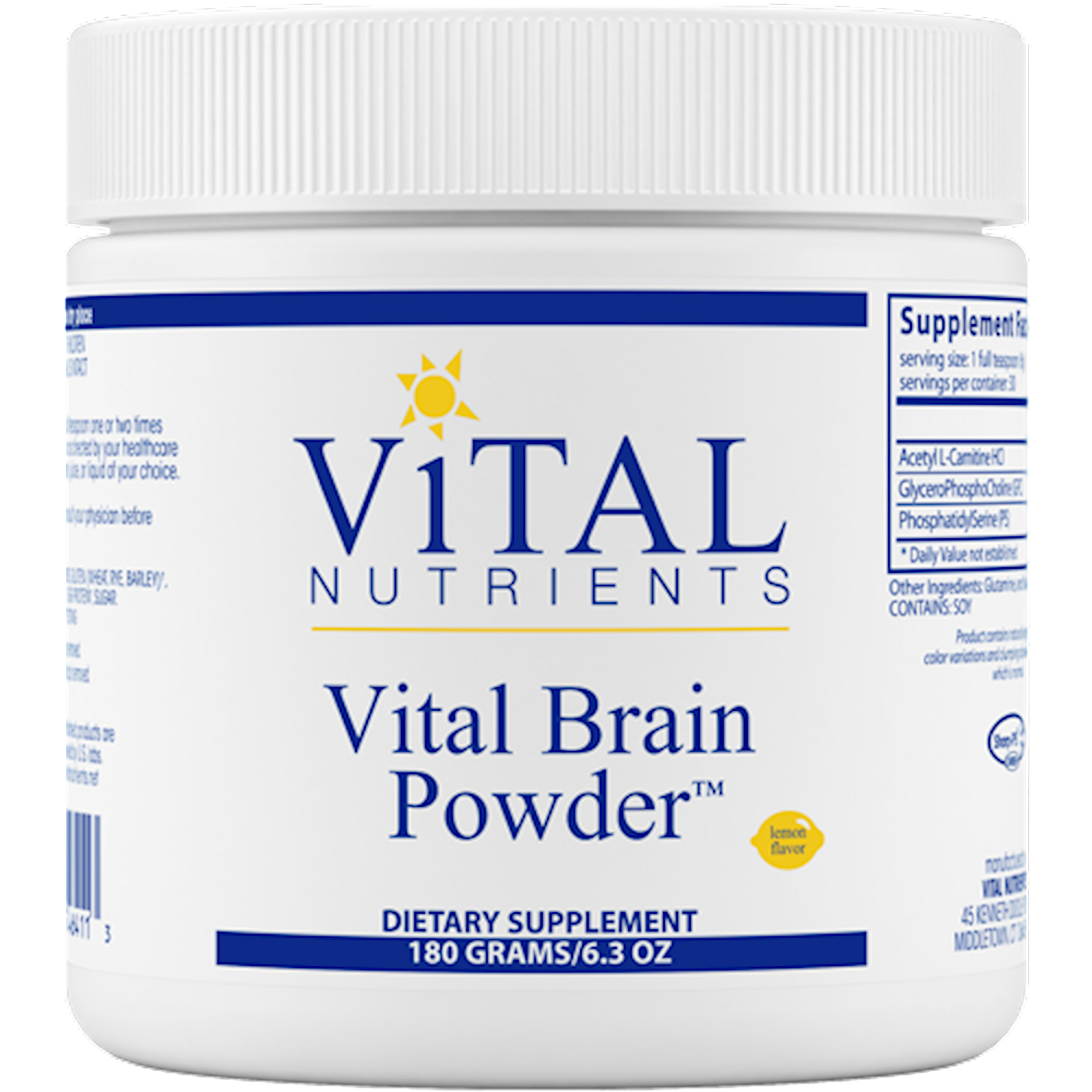 Supports brain health at all ages* Promotes memory and learning* Helps alleviate cognitive difficulties associated with healthy aging* Deliciously flavored with all natural crystallized lemon Vital Brain Powder is a supplement for mental performance, brain vitality, and helping to restore brain function associated with healthy aging.* The powerful nutrients support mental focus, memory, concentration, positive outlook and brain wellness.* Vital Brain contains Glycero-PhosphoCholine (GPC), Acetyl L-Carnitine HCl (ALC), and Phosphatidyl Serine (PS). GPC is an effective brain nutrient that supports brain health in all age groups.* ALC supports older adults by helping lessen fatigue in body and mind.* PS helps benefit memory, learning, concentration, word choice, mood, coping with stress and other cognition parameters.* Vital Nutrients offers an all-natural, refreshing, lemon flavored Vital Brain Powder in a 90g and 180g serving size.