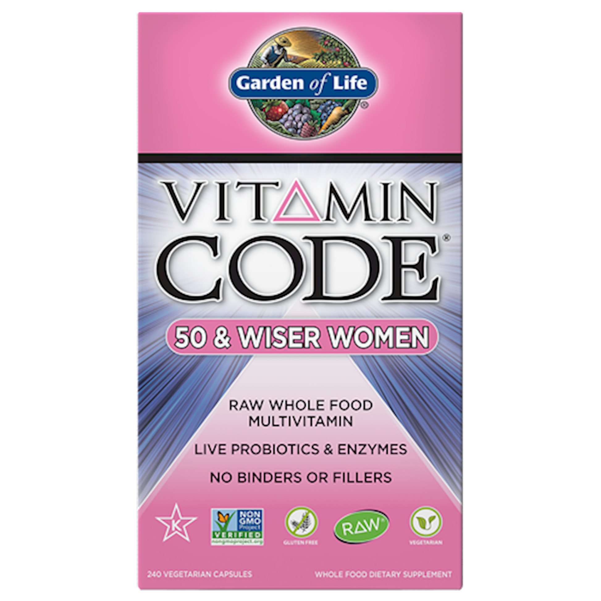 Made with individually grown nutrients utilizing probiotic cultivation to produce RAW Food-Created Nutrients, Vitamin Code supplements are delivered in a whole food base of fruits and vegetables. Vitamin Code supplements are RAW, which not only means that they are produced below 115 F, but also means that these nutrients come with their natural cofactors, along with live probiotics and enzymes, just like raw foods! Vitamin Code raw powders are delivered in capsules without any binders or fillerseverything you want and nothing you dont want. Vitamin Code 50 & Wiser Women is a comprehensive RAW whole food multi-nutrient formula, specifically formulated to meet the unique needs of women over 50, providing the nourishment the body craves to support optimal health and well-being.* Twenty-three fruits and vegetables add supporting antioxidants, vitamins and nutrient cofactors. RAW means no high heat, synthetic binders, fillers, artificial flavors, sweeteners, colors or additives commonly used in tablets. Whole food means RAW Food-Created Nutrients are blended in a base of 23 fruits and vegetables together with food cofactors. **To help support blood pressure levels already within the normal range. Vitamin Code 50 & Wiser Women Benefits: Supports bone strength* Supports breast and thyroid health* Supports healthy heart and blood pressure levels already within the normal range** Supports healthy digestion with live probiotics and enzymes* Vitamin Code 50 & Wiser Womencomprehensive RAW whole food multi-nutrient formula to meet the needs of women over 50.