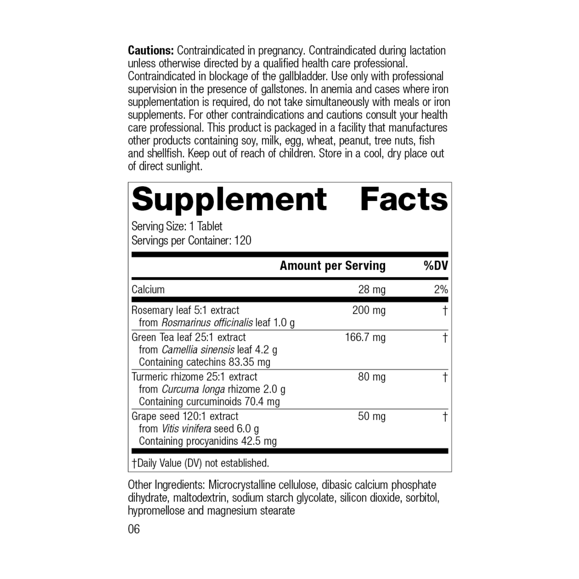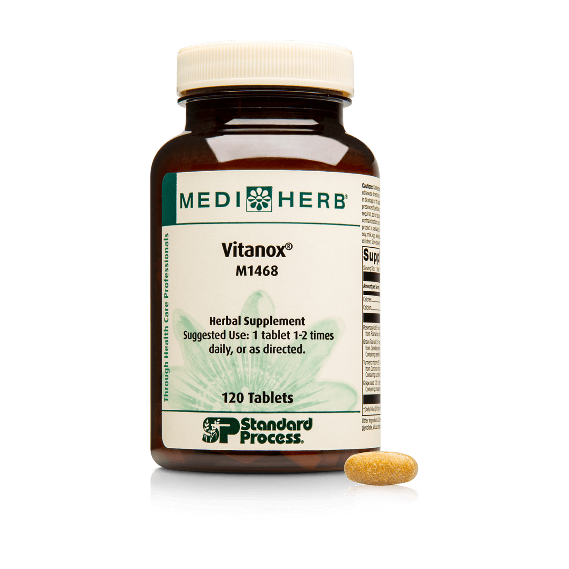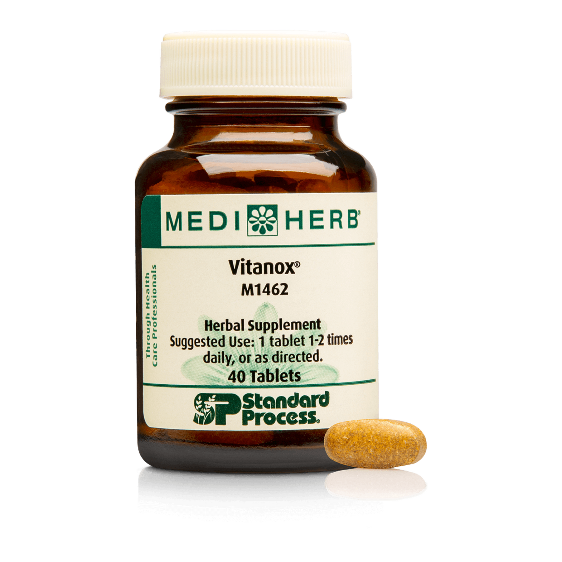 The herbs in Vitanox provide phenolic diterpenes (including carnosol and rosmarinic acid), polyphenols including epigallocatechin gallate, essential oils containing sesquiterpenes, yellow pigments referred to as diarylheptanoids (including curcumin), flavonoids, triterpenoids and oligomeric procyanidins. This product is standardized to contain 83.35 mg of catechins, 70.4 mg of curcuminoids and 42.5 mg of procyanidins in each tablet to ensure optimal strength and quality